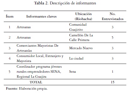 Se realizaron entrevistas a profundidad teniendo en cuenta la representativi-dad de cada uno de los actores escogidos de manera aleatoria, pertenecientes al mercado wayú. Igualmente, la inmersión en el área de la investigación facilitó la observación –participante o no– apoyada en videofilmación de escenarios de las prácticas comerciales artesanales analizadas para aportar a los resultados. Las fuentes segundarias fueron obtenidas de instituciones públicas y privadas, como el Servicio Nacional de Aprendizaje (sena) y banco de datos de la Universidad de La Guajira, y se revisaron artículos científicos y trabajos de tesis relacionados con el tema.