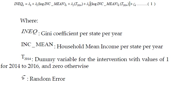 In this case, we are including an indicator variable to control for the new policy implementation and an interaction term to allow for a possible change in slope. The dependent variable is the Gini coefficient measured as an index with a range from 0 to 100 to avoid having very small coefficients, and to simplify their interpretation. The independent variables are household mean income in logarithmic form, an indicator variable to account for a change in the intercept due to the new policy, an interaction term between household mean income (in logarithmic form), and the time dummy variable. This variable will account for changes in the slope of the regression line.