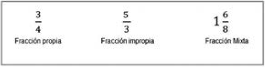 M: Bueno, hay tres tipos de fracciones, por ejemplo, ésta, 3/4, es una fracción propia. Hay otras, por ejemplo 5/3, es una fracción impropia. Y la otra, es una fracción mixta. Tenemos tres tipos de fracciones que son: la propia, la impropia y la mixta. ¿Qué diferencia hay en las fracciones que tenemos aquí?