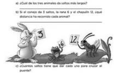 M: Inciso “A”, ¿Cuál de los animales da el salto más largo? (…) Inciso “B”, Si el conejo da tres saltos, la rana seis y el chapulín doce, ¿qué distancia han recorrido? (…) Ojo, estos son los saltos del chapulín (lo escribe en el pizarrón) y estos son los que da la rana, 1... 2... 3... 4... (los va contando). ¿Y ahora cuantos da el chapulín?