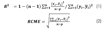 y son valores observados, estimados y media del volumen; n y p son el número de observaciones y de parámetros, respectivamente.