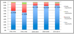 La importancia del trabajo en México a través de 20 años muestra un comportamiento estadístico peculiar (figura 1). Como se aprecia, hay dos etapas de alta centralidad del trabajo. La primera en las muestras de 1990-1994 y 1995-1998, en las que la valoración como “Muy importante” fue de 66.9 y 61 puntos porcentuales, respectivamente; cuya orientación es a la baja en porcentaje de encuestados con alta valoración al trabajo. Inmediatamente se percibe un crecimiento abrupto hasta alcanzar 86.1, 84.9 y 87.0.