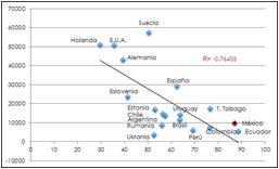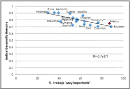 En la figura 4 se aprecia que la correlación es similar a la de anteriores revisiones, ya que la orientación es negativa, con valor de -0.7657759. Por tanto, la relación indica que cuanto mayor IDH menor valoración al trabajo. Al mismo tiempo, la ubicación en la dispersión de los países con menores índices de desarrollo humano se agrupan en un sector de mayor centralidad al trabajo. Aquí se ubican Ecuador, México, Perú, Colombia y Trinidad y Tobago. México se ubica al extremo inferior de la línea de tendencia con países de bajo desarrollo humano y alta centralidad al trabajo; mientras que en el otro extremo de la recta se ubican Alemania, Holanda y Estados Unidos, lo que revela una correspondencia entre alto desarrollo humano y menor centralidad al trabajo.