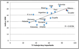 Con respeto al Índice de desigualdad GINI (Indicador de distribución del ingreso que fluctúa entre el valor 0, que indica igualdad absoluta y 1, desigualdad absoluta) los resultados no son tan distintos al ejercicio anterior, ya que el coeficiente de correlación señala 0.6539. En la figura 3 se aprecia la directriz. Por tanto, se ve que los países con mayor desigualdad como Ecuador, México, Colombia y Perú son los que valoran en mayor medida al trabajo como muy importante.
