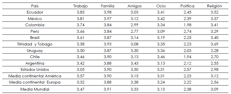 Particularmente, el caso de México deja ver que el trabajo (3.81) es importante solamente después del ámbito familiar (3.97). Además, es el segundo país que más considera a la actividad como valiosa, sólo por debajo de Ecuador (3.83). Incluso la media de valoración se localiza muy arriba del promedio americano (3.57), europeo (3.32) y mundial (3.47).