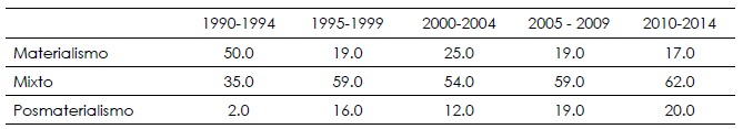 La importancia del trabajo en México tiende hacia un incremento exponencial, ha pasado de 66.9% a 87%; lo cual admite las tesis de que el incremento de la importancia del trabajo es una tendencia clara y sostenida (De la Garza Toledo, 2010), a diferencia de lo que se diagnostica en países Europeos (Bauman, 2000, 2004; Beck, 2007). Sin embargo, las razones de tal proceso responden a la propuesta teórica de la posmaterialidad que supone: entre mayores niveles de bienestar material tenga una nación o país, su valoración se centrará en aspectos no materiales. El caso de México coincide en que sus condiciones macroeconómicas escasas influyen positivamente en la propensión a su alta valoración al trabajo como importante. Por tanto, pareciera que la sociedad mexicana se ubica en el grupo de culturas materialistas, tal como se ha vaticinado previamente (Inglehart, 1998). Esto, sin embargo, contrasta con los resultados que la propia lógica de razonamiento de la Encuesta Mundial de Valores ofrece mediante su índice que señala la propensión hacia la posmaterialidad. Empero, el carácter mixto es predominante en la mayoría de periodos de análisis (tabla 3).