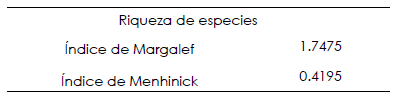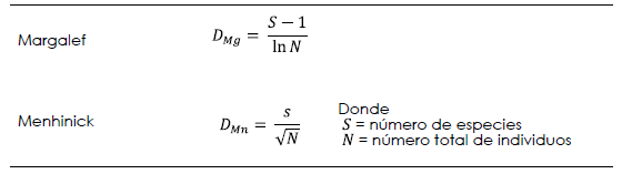 Con la información recopilada se estimaron índices de biodiversidad dentro de los cuales se estimó la riqueza de especies a través de los índices de Margalef y Menhinick (tabla 1): los cuales cuantifican el número de especies presentes.