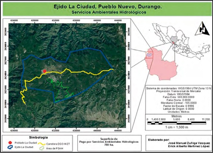En cuanto al área de estudio, el ejido La Ciudad se ubica en el macizo montañoso denominado Sierra Madre Occidental dentro del municipio de Pueblo Nuevo (figura 1). Los principales tipos de clima son C (E) (M): semifrío húmedo, C (E) (W2): semifrío subhúmedo, C (W2): templado subhúmedo, todos con lluvias en verano, la precipitación media anual es de 1200 m.m., y una temperatura media anual de 18 ºC, con máximas de 22 ºC y mínimas de 3 ºC (UPSE 6, 2009). El área destinada a pago por servicios ambientales hidrológicos cuenta con una superficie de 780 hectáreas.