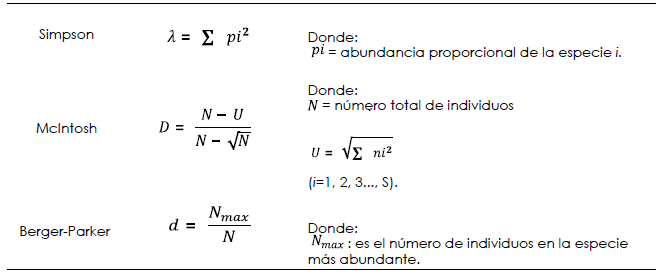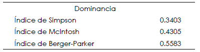 También se estimó la dominancia de las especies con los índices Simpson, McIntosh y Berger-Parker (tabla 2); estos son métodos sustentados en la estructura ya que calculan la distribución proporcional del valor de importancia de cada especie, como la abundancia relativa; es decir, identifican las especies más comunes.