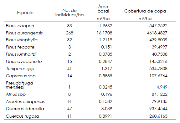 Los valores de importancia de las especies más altos fueron del género Pinus, seguidos del género Quercus, lo cual describe que el área de PSAH en su mayoría es un bosque mezclado de pino-encino. La especie dominante del área fue Pinus durangensis y la menos representativa fue Pseudotsuga mensiezii, es muy importante poner atención en las especies de baja representatividad, ya que una especie rara o escasa en una comunidad es sustituida por otra que es abundante, por tanto, la diversidad disminuye y las especies dominantes colonizan las áreas que quedaron de las especies que fueron eliminadas. Magurran (1988) menciona que el identificar un cambio en la diversidad, ya sea en el número de especies, en la distribución de la abundancia de las especies o en la dominancia, alerta acerca de procesos empobrecedores.