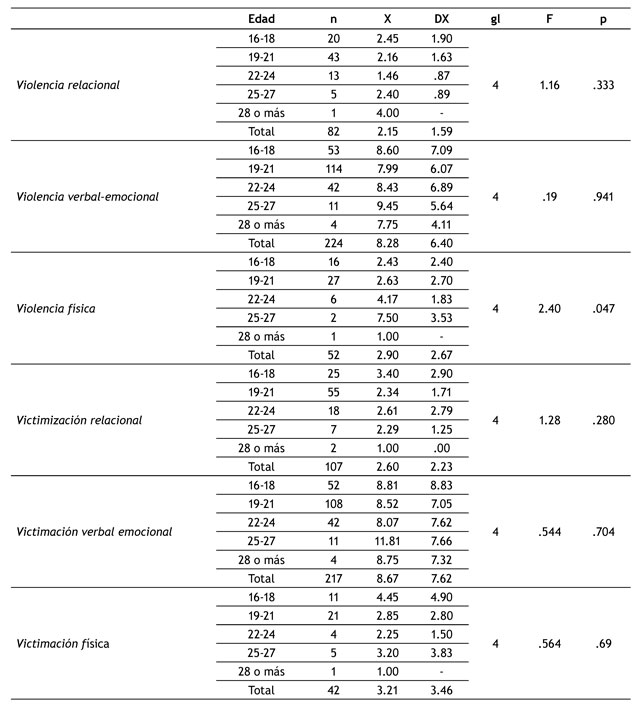 En promedio, se halló que el comportamiento violento más frecuente fue el verbal emocional, seguido por el físico y el relacional, encontrándose diferencias estadísticamente significativas en cuanto a la edad en la violencia física (F[1,234] = 2.40, p = .047). Respecto a las experiencias de victimización, los resultados también muestran que la victimización verbal emocional fue más frecuente que los otros tipos de victimización (física y relacional, en ese orden). En ese caso, no se encontraron diferencias estadísticamente significativas respecto a la edad (ver tabla 2).