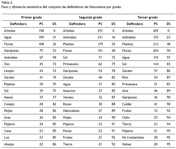 En segundo de primaria, el tamaño de red (TR) fue de 51 palabras y el núcleo de red se conformó por 23 palabras. Para tercero de primaria, el tamaño de la red (TR) fue de 50 palabras y el núcleo de red fue de 20 palabras. En los resultados de la red semántica de los alumnos de cuarto de primaria, un tamaño de red (TR) de 58 palabras definidoras de Naturaleza y al realizar la suma de la ponderación de la frecuencia por la jerarquización para obtener el peso semántico se incluyeron en el núcleo de red 28 palabras; la definidora 9 ya no se incluyó debido a que representó el punto de quiebre donde el peso semántico se volvía asintótico. En los resultados de la red semántica de los alumnos de quinto de primaria, la red se integró por 57 palabras definidoras y se incluyeron en el núcleo de red de 25 palabras.