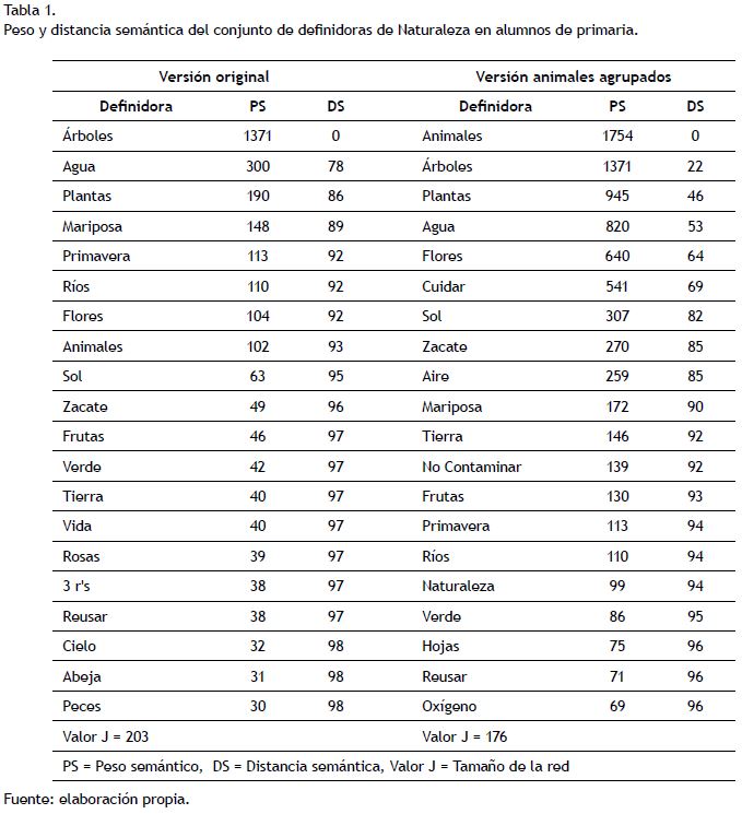 Sánchez, De la Garza y López (2011) investigaron con redes semánticas diversos conceptos relacionados al medio ambiente: ciudad, contaminación, deforestación, naturaleza, ecología, medio-ambiente y reciclaje, donde compararon las aportaciones de estudiantes de biología y psicología. En la red del estímulo Naturaleza derivada de las participaciones de los estudiantes de psicología tuvo un valor J (tamaño de la red) de 165 palabras donde las definidoras más importantes fueron: animales, árboles, plantas, verde, vida, ríos, bonita, fauna, bosques y flora; por otra parte respecto a las aportaciones de los estudiantes de biología el término naturaleza tuvo un valor J de 177 definidoras, donde las destacadas fueron: animales, plantas, vida, verde, bonita, flora, fauna, ambiente, agua y árboles. Al finalizar la investigación, los autores señalan diferencias que tipifican a los grupos de acuerdo con las experiencias académicas, es decir los estudiantes de biología tendieron a definir los conceptos con términos revisados en su ámbito de estudio y por otra parte los estudiantes de psicología realizaron su representación con palabras que tiene que ver con el conocimiento cotidiano del área ambiental.