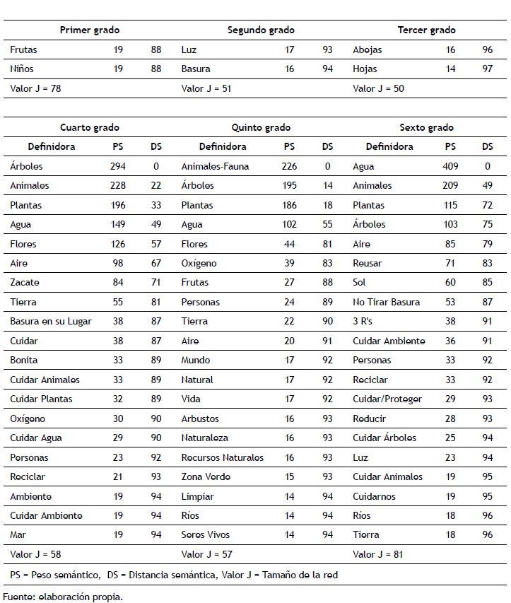 Del análisis de las palabras definidoras que integran la red semántica natural acerca del estímulo naturaleza, destacan los siguientes hallazgos: las palabras que se presentan en todos los núcleos de las redes semánticas (conjunto SAM) por grado aluden a árboles, animales, agua y sol, mientras que flores y tierra, aparecen en los núcleos de las redes semánticas por grado en cinco de los seis grados. Por otro lado, en la red general se menciona a los elementos aire, agua y tierra, sólo faltó hacer mención al fuego para que se consideraran los cuatro elementos de la naturaleza. Asimismo, se observó un aumento en el tamaño de la red en función del grado escolar, excluyendo la red de primero de primaria que incluía palabras no pertinentes al estímulo; adicionalmente se encontró que las personas o seres humanos, se presentan las redes semánticas de los grupos de cuarto, quinto y sexto grado. No obstante estos términos, no aparecen en el núcleo de la red general, lo que podría implicar que no están percibiendo a las personas como integrantes importantes de la naturaleza, y el considerarse como un ente externo a la naturaleza podría implicar futuros comportamientos anti-ambientales.