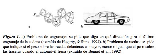 En este sentido, la memoria de trabajo y la velocidad de procesamiento se consideran variables cognitivas que impactan de manera directa en los procesos cognitivos de orden superior como el razonamiento y la comprensión. Existen distintos sistemas mecánicos, cada uno de los cuales hace uso de diferentes tipos de razonamiento en términos de su dependencia de estrategias y habilidades espaciales específicas. Uno de ellos es el sistema de engranajes, que requiere de la habilidad de inferir el movimiento de una pieza de un engranaje a partir del movimiento de otra pieza adyacente. Estos problemas pueden ser resueltos utilizando una estrategia de pasos sucesivos, que implica una cadena de inferencias de los movimientos de cada engranaje por separado (Hegarty & Sims, 1994).
