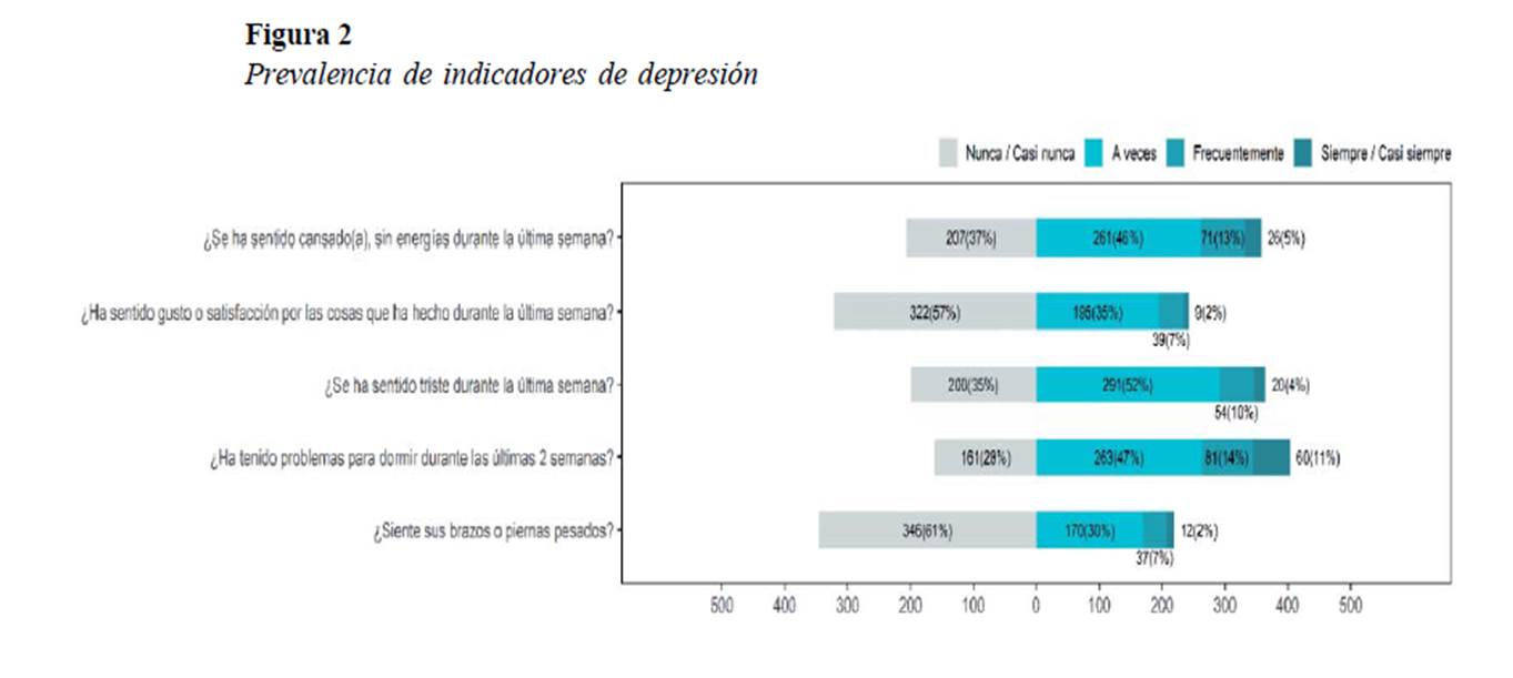 Los indicadores referidos a la sintomatología depresiva se presentan en la Figura 2. A diferencia del caso anterior, por lo menos un 39% de individuos refiere presentar dichos síntomas. Particularmente, el indicador con mayor prevalencia fue la presencia de problemas para conciliar el sueño en 72% de individuos.
