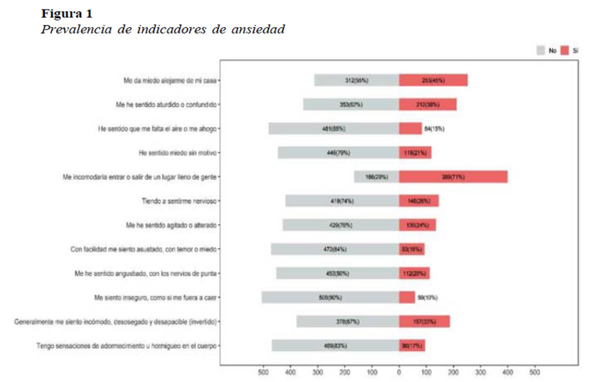 En la Figura 1 se presentan la frecuencia de indicadores de ansiedad en adultos de Lima Metropolitana. En general, por lo menos un 10% de los individuos refieren presentar el indicador respectivo. Sin embargo, en todos los indicadores hay una prevalencia menor al 50% de casos, con excepción del indicador referido a la incomodidad con respecto a entrar o salir de un lugar lleno de gente.