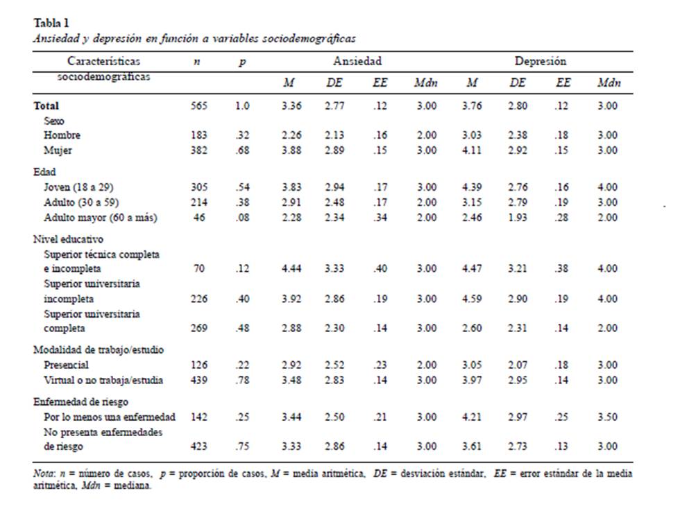 Al haber obtenido propiedades psicométricas satisfactorias, se analizaron las variables del estudio a partir de estadísticos descriptivos segregados por las variables sociodemográficas sexo, edad, nivel educativo, modalidad de trabajo/estudio y presencia de enfermedad de riesgo. Al observar la presencia de múltiples valores extremos en varias distribuciones, se procedió a emplear estadísticos robustos ante estos casos; específicamente, estrategias no paramétricas para la comparación entre grupos. Para variables de dos grupos se empleó la U de Mann- Whitney; y, para múltiples grupos, la H de Kruskal- Wallis. La U de Mann-Whitney también fue utilizada como prueba post-hoc para complementar la H, pero considerando la corrección de Bonferroni sobre el nivel de significancia de .05 para controlar el error Tipo I producto de implementar múltiples pruebas de significancia. El tamaño del efecto en cada comparación fue estimado a partir de la correlación rango-biserial, la cual puede interpretarse según las sugerencias de Cohen (1992). Todas las comparaciones fueron realizadas con el programa JASP (versión 0.12.2), un software libre con amplias herramientas para la investigación en ciencias sociales.