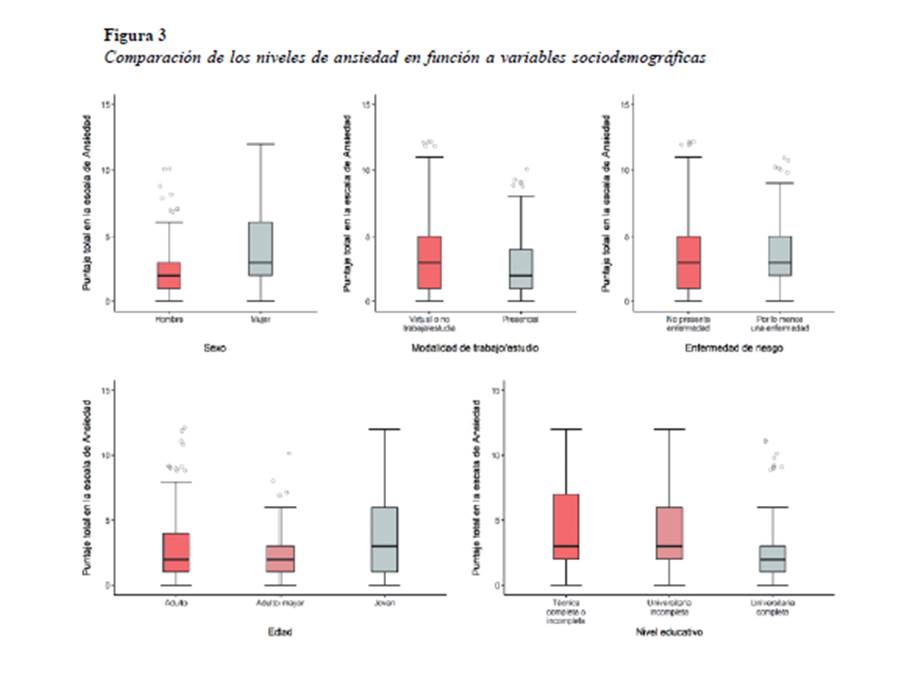 La comparación de los niveles de ansiedad en función a distintas variables sociodemográficas se presenta en la Figura 1. Con respecto al análisis de acuerdo al sexo, se encontraron diferencias estadísticamente significativas entre las puntuaciones obtenidas por hombres (Mdn = 2.00) y mujeres (Mdn = 3.00), U = 27478 , p < .001 con un tamaño del efecto mediano (r = -.36).