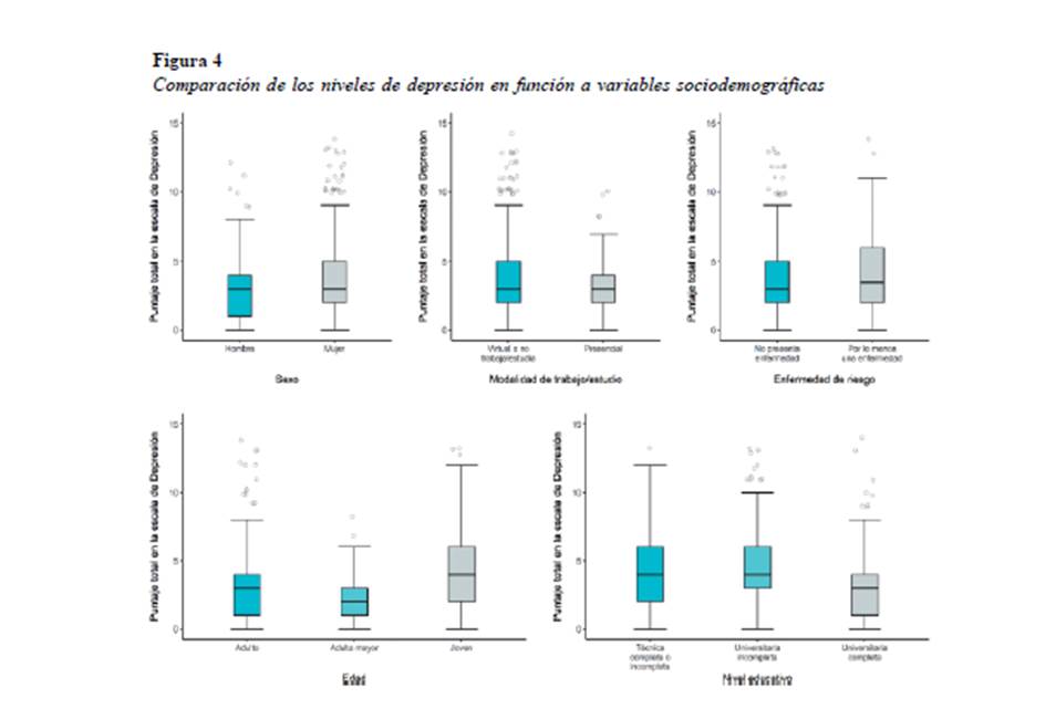 Finalmente, se encontró que las personas que trabajaban o estudiaban de forma virtual mostraron mayores niveles de ansiedad y depresión respecto a las personas que trabajaban de manera presencial, aunque estas diferencias fueron pequeñas. Con respecto a la diferencia en los puntajes de ansiedad, Hilliard et al. (2020) explican que esto puede deberse a la incertidumbre ligada al ambiente de trabajo, sobre todo cuando el trabajo puede ser evaluado. Por otro lado, el mayor nivel de depresión puede deberse al sentimiento de soledad generado por la modalidad virtual (Misirlis et al., 2020) y al aumento de demandas familiares (Cho, 2020).