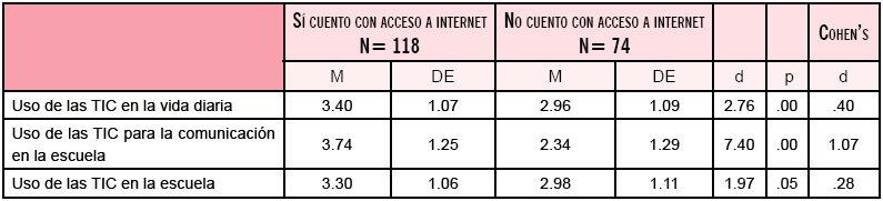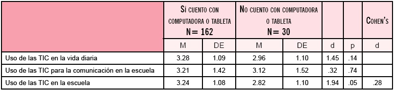 Asimismo, realizamos una prueba t de Student para determinar si existen diferencias entre los estudiantes que cuentan con computadora o tableta electrónica, o no; solamente encontramos diferencias significativas en la dimensión sobre el uso de las TIC en la escuela (ver tabla 2).