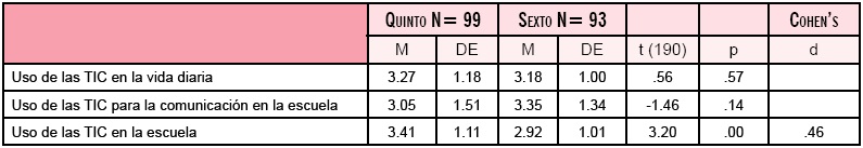 A fin de determinar si existen diferencias entre los grupos de quinto y sexto grado, aplicamos una prueba t de Student mediante la cual obtuvimos que sí existen diferencias significativas, pero solo en la dimensión del uso de las TIC en la escuela (ver tabla 3). Lo anterior significa que los alumnos de más pequeños se perciben más competentes en el uso de las TIC en la escuela, es decir, utilizan más estas para actividades académicas que los alumnos de sexto. Esto puede deberse a que para los estudiantes de quinto grado es una novedad emplear las computadoras portátiles o tabletas electrónicas con propósitos académicos, y puedan acceder a los diferentes materiales didácticos digitales; por lo tanto, están motivados y se sienten más competentes que los alumnos de sexto grado, para quienes el uso de las TIC en la escuela ya no es una novedad.