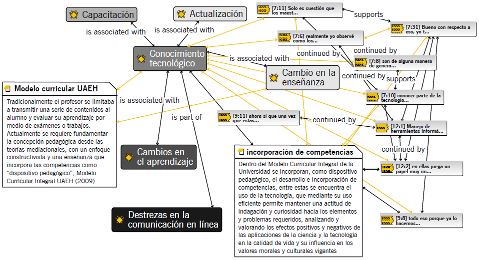 El conocimiento tecnológico es uno de los aspectos más citados por las personas entrevistadas, ya que coinciden en que el manejo de las herramientas informáticas, plataformas tecnológicas e internet es necesario para el adecuado proceso enseñanza-aprendizaje (ver Figura 12). Los comentarios anteriores se sustentan en lo que se establece en el modelo curricular de la UAEH respecto a la incorporación de competencias, entre ellas el uso de la tecnología.