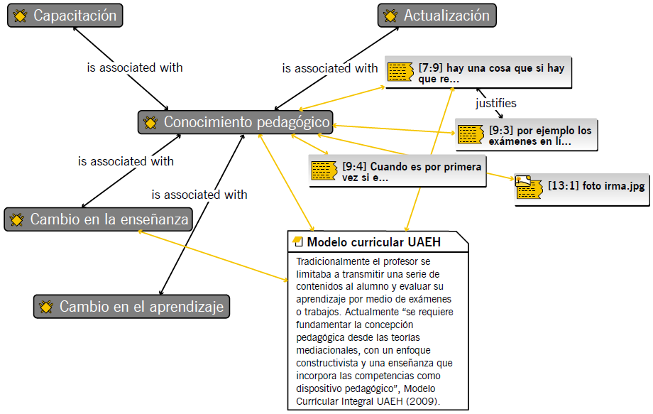 Respecto al conocimiento pedagógico, las afirmaciones de los entrevistados se sustentan en el modelo curricular de la UAEH, el cual indica que se requiere fundamentar la concepción pedagógica desde las teorías de mediación y con enfoque constructivista y una enseñanza que incorpora las competencias, en especial el uso de la tecnología como dispositivo pedagógico. Según los entrevistados, los profesores preparan alumnos para este mundo tecnológico y, por lo tanto, se deben atrever a buscar este tipo de herramientas, tratar de comprenderlas y, con la experiencia que tienen, vincularlas con el mundo laboral. La Figura 14 muestra gráficamente cada una de las categorías relacionadas con el conocimiento pedagógico.