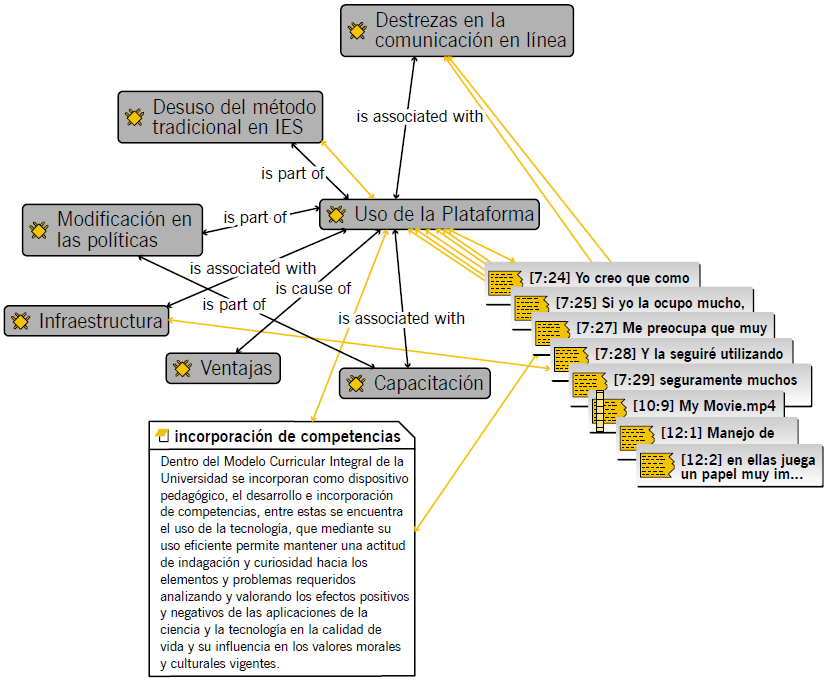 Es relevante lo expresado por los informantes en cuanto al uso de la plataforma, categoría que tiene que ver con la infraestructura, la capacitación, las ventajas, la modificación de las políticas, el desuso del modelo tradicional y las destrezas en la comunicación en línea. Los entrevistados afirmaron que la utilizan mucho y que las autoridades institucionales podrían, de alguna manera, motivar el empleo de esta herramienta; también aseguran que estarían de acuerdo en promover entre sus compañeros la utilización como apoyo a su actividad docente, comentario sustentado en el modelo curricular de la UAEH, que hace mención del manejo de la tecnología por parte del docente. Igualmente, les preocupa que pocos profesores estén recurriendo a ella y que la institución esté pagando por eso, con el riesgo de que en un futuro la universidad ya no quiera destinarle más recursos. La Figura 15 contiene cada una de las categorías relacionadas con el uso de la plataforma.