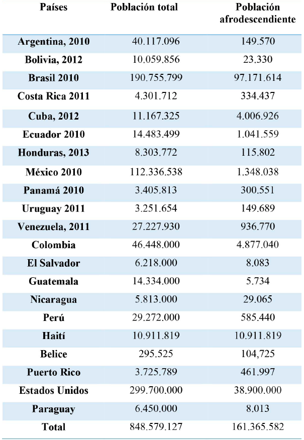 Pese al dato del tamaño de la población afrodescendiente en América Latina la cifra sigue siendo aproximada, pues no incluye Haití, República Dominicana, Belice, además de Puerto Rico, incluso faltando los Estados Unidos y otras naciones de las Antillas. Por tanto, complementando la cifra de CEPAL, en un intento por agrupar el grueso poblacional de los afrodescendientes en todo el Continente Americano, tomamos como fuente otros datos demográficos disponibles de Estados Unidos y Puerto Rico, Haití, Belice, Perú, México y Paraguay, dando como resultado 161.365.582 personas afrodescendientes, que equivaldrían al 19.01% de la región. (Tabla 1). Así Brasil sería el país con más afrodescendientes (50,7%), seguido por Cuba (36%), Puerto Rico (12,4%), Estados Unidos (13%), Colombia (10,2%), Panamá (8,88%), Uruguay (7.7%) Costa Rica (7.7%) y Ecuador (7,2%).
