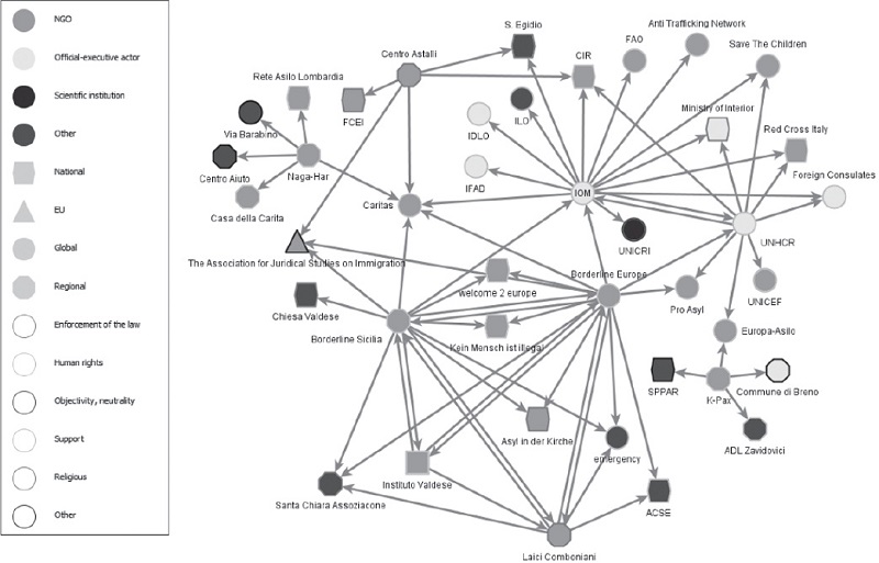 De los cinco países analizados, aquí sólo se presentan algunos hallazgos de Italia. Fue uno de los países de entrada más importantes de refugiados a partir de 2010. El auge de las llegadas de refugiados al sur de Italia fue desde 43 170 mil en 2010 a más de 200 000 refugiados en 2014. De estos doscientos mil, solamente 50 mil solicitaron asilo en ese país, los demás siguieron -la mayoría sin ningún registro en Italia- hacia Alemania, Austria y Suecia. Una prueba más del mal funcionamiento del sistema de Dublín desde antes de la crisis de 2015. En Italia fueron realizadas entrevistas de expertos a representantes de ORRAS, observaciones participantes y entrevistas con refugiados. En las ORRAS se preguntó a los representantes con qué organizaciones estaban interactuando en el asunto del refugio. También se levantó las características claves de estas organizaciones por su tipo (ONG, estatal, científica y otros tipos), por el nivel de trabajo de actividades (nacional, regional, europeo, global) y los valores que mueven a las organizaciones. De esta forma se podía reconstruir el tejido de organizaciones que se dedican al trabajo con refugiados. A continuación se muestra un esquema de la red de organizaciones en Italia (Gráfica 3).