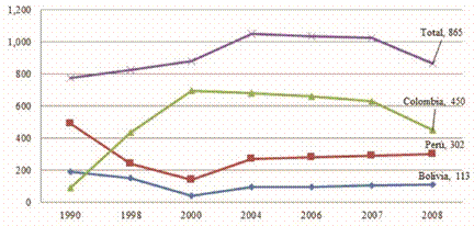 Existen en la región andina, tres países que cultivan la hoja coca, que es la planta que los narcos usan para producir la cocaína. Durante los ochenta, Bolivia y Perú produjeron la gran mayoría de la planta de coca. Por ejemplo, en 1985, Perú produjo el 65% del total de los cultivos, mientras que Bolivia produjo el 25%. En ese año, Colombia solamente cultivó el 10% de la coca (UNODC, 2010; UNODC, 2011). En ese entonces, estos tres países produjeron casi el 100% de la coca en el mundo. Así pues, la administración de Reagan apoyó a los gobiernos de Perú y Bolivia para combatir la producción de coca (Bagley, 2012a, 3-4; Rojas, 2005; Youngers, 2000).