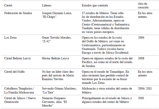 Como resultado de la guerra contra el narcotráfico se incrementó el número de cárteles de las drogas en el periodo de Calderón. En el 2006, había seis organizaciones de este tipo: el Cartel Milenio, La Familia Michoacana, El Cártel de Gofo, El Cártel de Tijuana, El Cártel de Juárez, y el Cártel del Pacífico. La situación y las dinámicas respecto a los cárteles son complejas y están cambiando constantemente en México (Bagley, 2012a, 9; Cook, 2007). En el año 2007 había ocho organizaciones, mientras que para el año 2010 el número aumentó a doce y en el 2012 se identificaron dieciséis cárteles. La fragmentación de los cárteles presenta mayores problemas para el gobierno pues las organizaciones pequeñas pueden funcionar más fácilmente porque no son tan perceptibles (Figura 2 y Cuadro 1).
