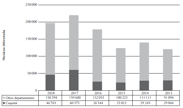 De acuerdo con el Ideam, en Colombia, para el año 2018 se deforestaron 197159 ha de bosque natural, de las cuales 46765 ha corresponden al departamento de Caquetá (cerca del 25% de la deforestación del país) (Ideam-smbyc, 2019). Esta constante de deforestación se ha mostrado a lo largo de los últimos años, como se aprecia en la figura 1.