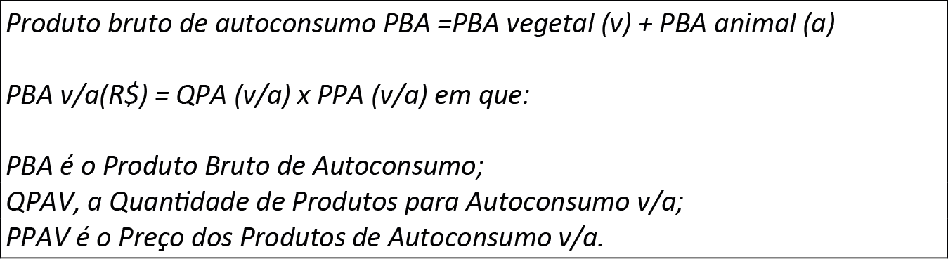 Os valores de autoconsumo, com base na pesquisa “Agricultura familiar, desenvolvimento local e pluralidade: a emergência de uma nova ruralidade no Rio Grande do Sul”, citada por Gazolla (2004) e Grisa (2007), passaram por adaptação, visando a contemplar os objetivos específicos deste estudo. Destaca-se que os alimentos de origem animal e vegetal foram calculados com a mesma fórmula. Assim, a equação geral utilizada neste estudo ficou definida da seguinte forma: