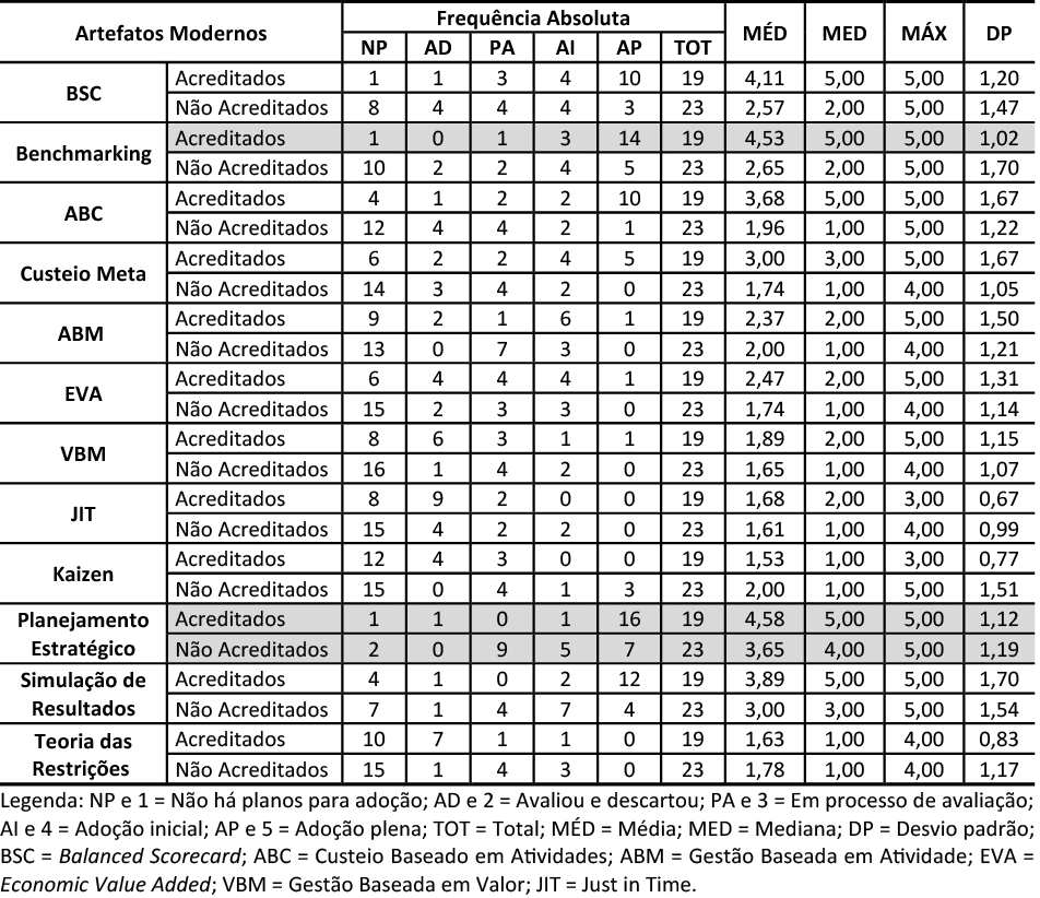 Na sequência a Tabela 5 evidencia o grau de adoção dos artefatos modernos de contabilidade gerencial.