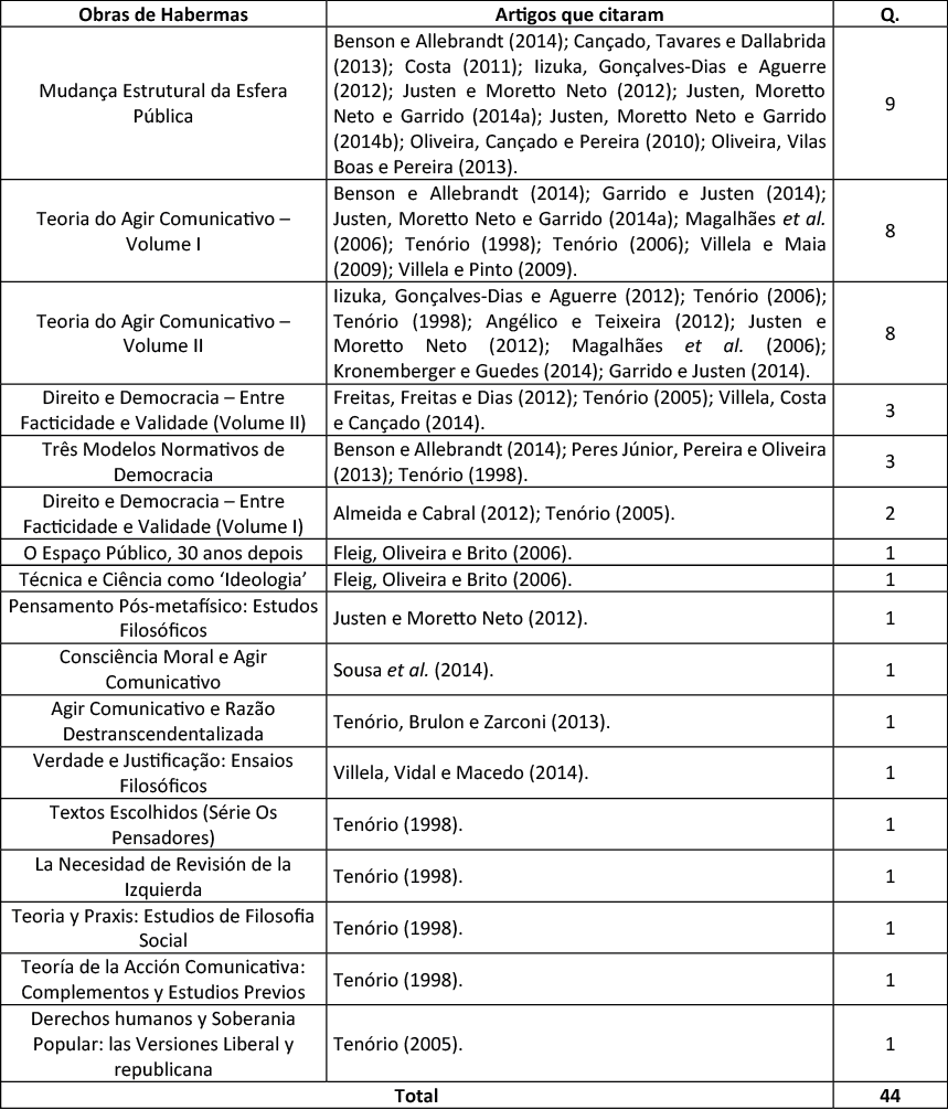Para discussão central deste artigo, no Quadro 1 apresentamos as obras de Habermas citadas pelos artigos mapeados. No total foram 44 referências bibliográficas. A obra mais citada foi Mudança Estrutural da Esfera Pública (9 vezes) e, em seguida, os volumes da Teoria do Agir Comunicativo (8 vezes cada).
