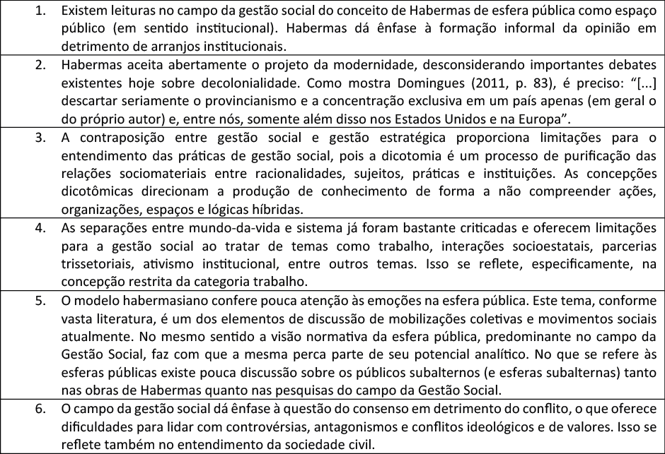 Seguindo nosso estudo, confirmamos a indicação de Habermas como autor importante para a construção dos conceitos de gestão social em Costa (2011), Garrido e Justen (2014), Justen e Moretto Neto (2012), Oliveira, Cançado e Pereira (2010) e Tenório, Brulon e Zarconi (2013), entre outros. Isso significa que parte do campo reconhece a importância dele para a fundamentação da Gestão Social, principalmente a partir dos conceitos de agir comunicativo e de esfera pública. Apesar do conhecimento da existência de outras críticas, no mapeamento realizado somente o texto de Justen, Moretto Neto e Garrido (2014a) faz críticas contundentes à apropriação de Habermas por parte de autores do campo da Gestão Social. Justen, Moretto Neto e Garrido (2014a) destacam as seguintes críticas a Habermas que, segundo eles, impactam nos ideais emancipatórios da Gestão Social: ideologia intelectualista; afastamento do materialismo; separação entre conhecimento e poder; foco na influência informal e interpretação restrita dos novos movimentos sociais. A partir disso, indicamos a realização de debates abertos e amplos sobre estas críticas. Como o mapeamento sistemático foi realizado somente em periódicos e de 1998 a janeiro de 2015, alertamos que estudos com críticas relevantes como de Pinho (2010), Pinho e Santos (2015), Persson e Moretto Neto (2015) e Persson (2016) não foram selecionados. Neste artigo buscamos neles contribuições para ampliar o debate em torno da apropriação dos conceitos habermasianos no campo da Gestão Social, considerando os limites das apropriações feitos pelos textos do mapeamento.