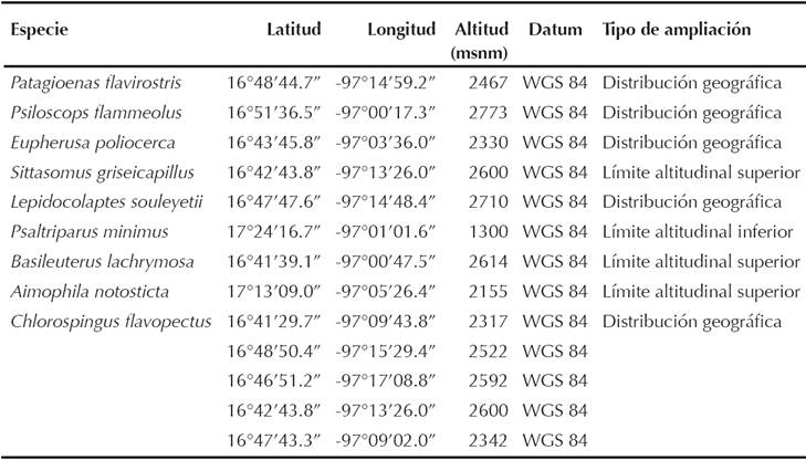 Los registros de cinco especies representan un incremento en el conocimiento de su distribución geográfica para las montañas del centro-occidente de Oaxaca, de las cuales, tres: Patagioenas flavirostris, Lepidocolaptes souleyetii y Chlorospingus flavopectus sólo figuran en las montañas del norte y sur de Oaxaca; una en las montañas del occidente: Eupherusa poliocerca, y otra sólo en las montañas del norte: Psiloscops flammeolus (Howell y Webb 1995, Navarro-Sigüenza y Peterson 2007d, 2007g, 2007i, 2007m, 2007n; Cuadro 1).