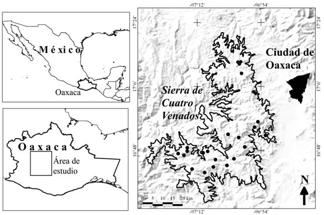 La Sierra de Cuatro Venados (16°30' a 17°20'N, 96°49' a 97°26'O; Figura 1) se encuentra en la subprovincia fisiográfica Montañas y Valles del Occidente de Oaxaca, y en la provincia fisiográfica Sierra Madre del Sur de México. Tiene una superficie de 2 210 km2 y una orientación general norte-sur que se extiende al oeste en la porción austral; su rango altitudinal es de 1 600 a 3 000 msnm; (Ortiz-Pérez et al. 2004). El clima de la región es templado subhúmedo: C(w1) y C(w2) y semicálido subhúmedo: (A)C(w1) y (A)C(w2) (INEGI 2000, Trejo 2004). Los tipos de vegetación predominantes son el bosque de pino-encino, bosque de pino y bosque de encino (IGUNAM-INEGI-INE 2000, Torres-Colín 2004).