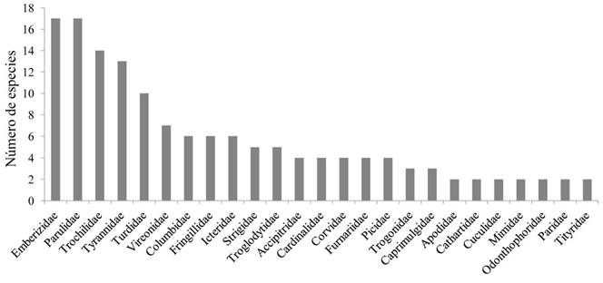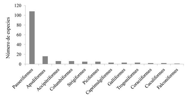 La riqueza avifaunística de la Sierra de Cuatro Venados fue de 160 especies, mismas que están distribuidas en 38 familias y 12 órdenes (Anexo 1). Con el trabajo de campo obtuvimos 127 especies (79.37%) y en literatura 76 especies (47.50%). El número de especies está respaldado con 936 registros, de los cuales 681 (72.75%) fueron observaciones en búsqueda intensiva o incidentales, 135 (14.42%) fueron capturas en redes de niebla y 120 (12.00%) los obtuvimos de literatura científica. El orden Passeriformes fue el mejor representado (67.50%), seguido por Apodiformes (10.00%; Figura 2). Las familias que concentraron el mayor número de especies fueron Parulidae (10.62%), Emberizidae (10.62%), Trochillidae (8.75%), Tyrannidae (8.12%) y Turdidae (6.25%;) (Figura 3); mientras que 14 familias estuvieron representadas cada una por una especie (e. g., Cracidae, Ramphastidae, Sittidae).