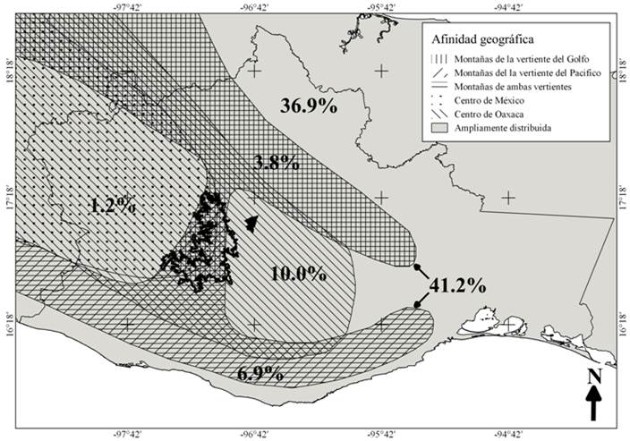 Con esta nueva información de la distribución geográfica de las aves en el centro-occidente de Oaxaca, observamos que en la Sierra de Cuatro Venados convergen especies con seis patrones de afinidad geográfica (Figura 4): 1) especies con distribución geográfica en las montañas de ambas vertientes oceánicas (66 especies, 41.25%); 2) especies distribuidas ampliamente en Oaxaca (59 especies, 36.87%); 3) especies con distribución geográfica en el centro de Oaxaca (16 especies, 10.00%); 4) especies con una distribución geográfica en las montañas de la vertiente del Pacífico (11 especies, 6.87%); 5) especies con una distribución geográfica en las montañas de la vertiente del Atlántico (seis especies, 3.75%), y 6) especies del centro de México que encuentran su límite de distribución geográfica en la Sierra de Cuatro Venados (dos especies, 1.25%).