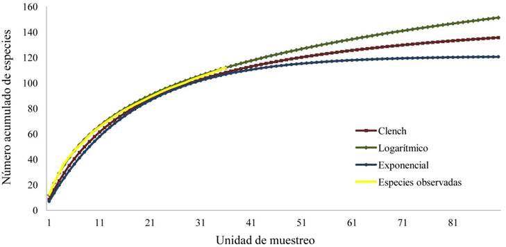 El modelo de acumulación de especies que mejor se ajustó a los datos con los métodos de redes de niebla y búsqueda intensiva fue el logarítmico (rho=0.997) y estuvo seguido por el modelo de Clench (rho=0.993). Las curvas de acumulación de especies no alcanzaron una asíntota (Figura 5), el modelo logarítmico la estimó en 133 especies, mientras que el modelo de Clench en 163 y el exponencial en 121 especies.
