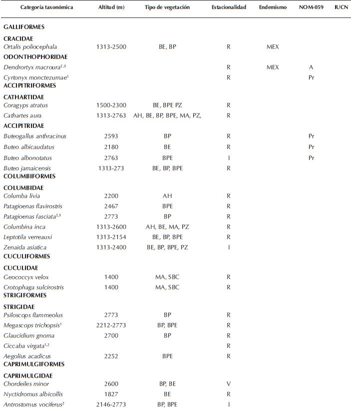 La estacionalidad la obtuvimos de los trabajos de Binford (1989), Howell y Webb (1995), Navarro-Sigüenza et al. (2004) y por observaciones de campo. Para identificar el tipo de endemismos consultamos los trabajos de Navarro-Sigüenza et al. (2004) y Howell y Webb (1995). A partir del trabajo de Binford (1989) y los mapas de Howell y Webb (1995) identificamos la afinidad geográfica de las aves registradas en la Sierra de Cuatro Venados y obtuvimos la proporción en cada una de ellas. Finalmente, el estado de conservación lo obtuvimos de la Norma Oficial Mexicana 059 (SEMARNAT 2010), y de la lista roja de la Unión Internacional para la Conservación de la Naturaleza (IUCN 2015).