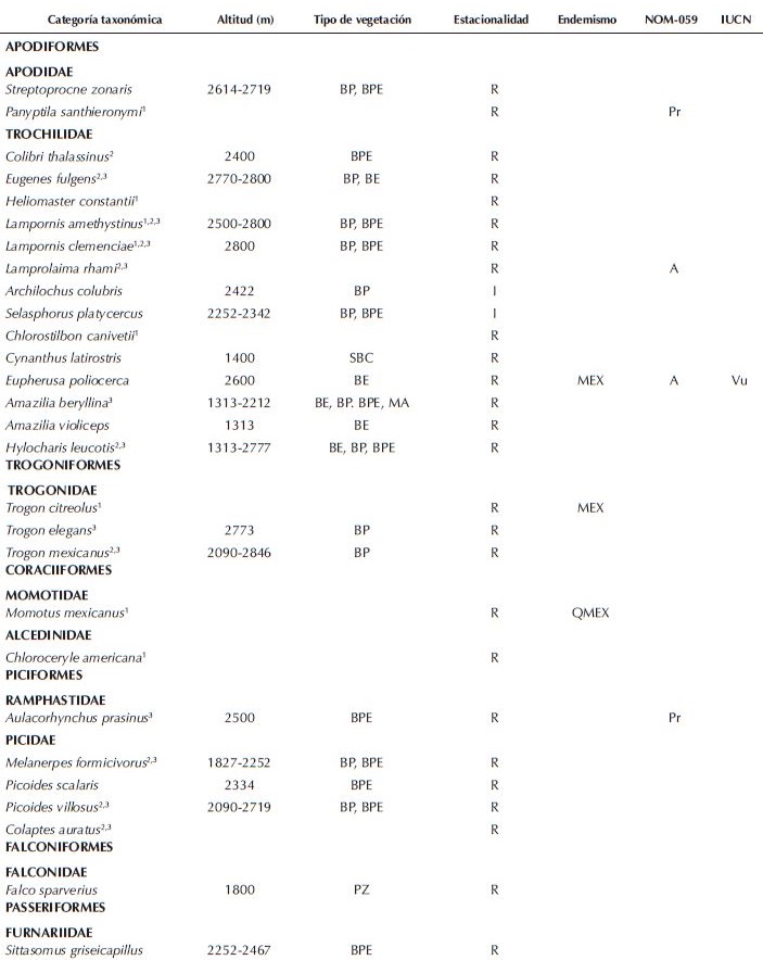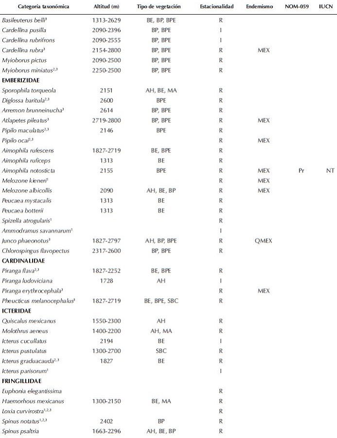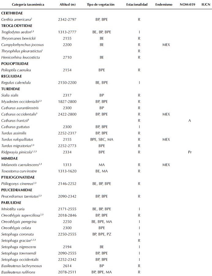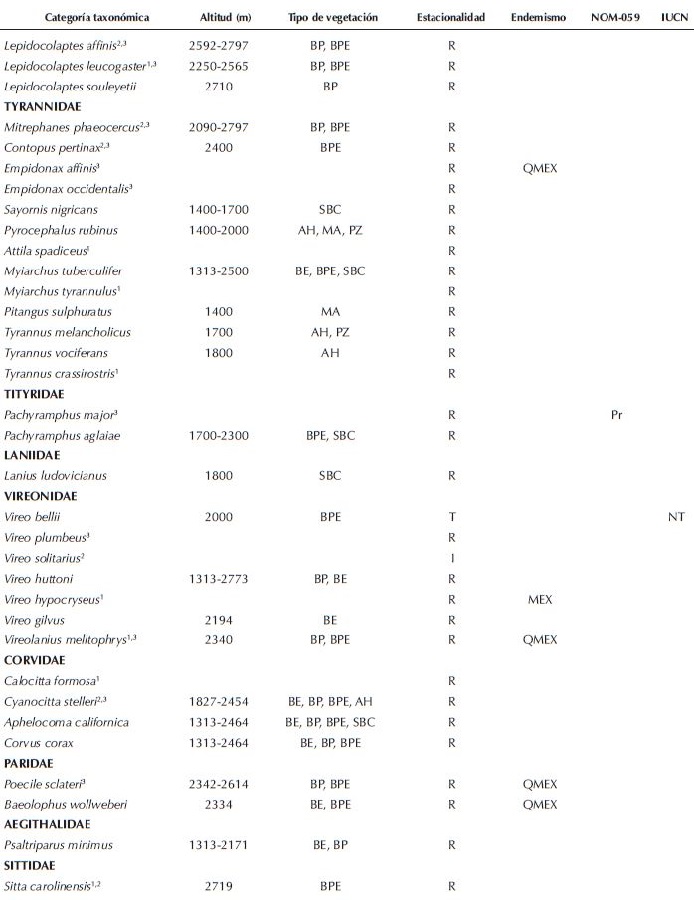 Mediante las observaciones de campo incrementamos los límites altitudinales superiores de Sittasomus griseicapillus de 2 000 a 2 600 msnm, de Basileuterus lachrymosa de 1 800 a 2 614 msnm y de Aimophila notosticta de 1 900 a 2 155 msnm (Binford 1989, Howell y Webb 1995, Gómez de Silva 1997, Schaldach et al. 1997, Bojorges-Baños 2004, DeSucre-Medrano et al. 2010). Por otro lado, de Psaltriparus minimus ampliamos el límite altitudinal inferior de 1 500 a 1 300 msnm (Howell y Webb 1995) (Cuadro 1).