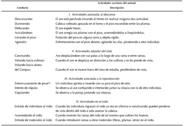 Con la finalidad de caracterizar a las parvadas, contamos el número de individuos observados que realizaban cualquier actividad individual o conjuntamente (Cuadro 1) en el área alrededor de los nidos (aproximadamente 20-25 m); esto es, desde un solo individuo hasta varios, volando, forrajeando, perchando y otros. Además, con base en la clasificación de las actividades de las cotorras, desarrollamos un etograma en el que registramos las frecuencias de conductas hacia individuos de la misma especie u otras; ambos procedimientos los realizamos a la par del muestreo de abundancia.