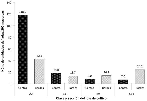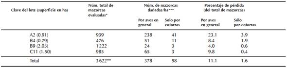 Los cuatro lotes muestreados presentaron mazorcas dañadas por cotorras y otras aves. El número de elotes dañados, así como su ubicación dentro de las parcelas varió en cada lote (Cuadro 3, Figura 8). Encontramos diferencias significativas en los promedios de mazorcas dañadas y no dañadas por aves de los cuatro lotes (t = -4.99; P = 0.02); esto es, el número de elotes sin daño fue mayor al de los dañados. Además, al comparar las mazorcas dañadas entre la sección centro y borde de los cuatro lotes encontramos diferencias significativas (χ² = 36.1, gl = 3, P = 0.00); es decir, el daño tiende a presentarse con mayor intensidad en los bordes de los lotes.