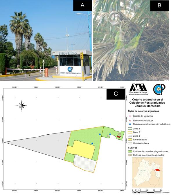 Entre 2010 y 2011 se estableció una pequeña colonia de esta ave en el Campus Montecillo del Colegio de Postgraduados (institución dedicada a la docencia, investigación y vinculación en ciencias agrícolas y disciplinas afines) en Texcoco, Estado de México. Desde su llegada, estas aves se han alimentado de los cultivos experimentales de la institución; sin embargo, hasta el momento, no se había evaluado su impacto en las cosechas, ni tampoco su interacción con las aves nativas. Por consiguiente, el objetivo de la presente investigación fue evaluar el daño agrícola y la posible agresividad hacia especies de aves nativas, con el fin de determinar cuantitativamente el impacto que M. monachus, como especie exótica, ejerce sobre el agroecosistema receptor.
