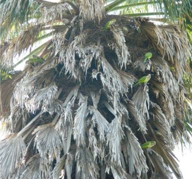 Ramírez-Albores (2012) reportó sólo dos nidos de cotorra ubicados a la entrada del Campus y contabilizó en ellos un total de 16 individuos, mientras que en la presente investigación observamos ocho nidos con un máximo de ocupación simultánea de aproximadamente 23 aves. Los árboles parecen ser un factor limitante para la distribución de la cotorra argentina (Rodríguez-Pastor et al. 2012), por lo que es de esperar que la selección de los tipos de árboles en donde construyen sus nidos no sea aleatoria (Burger y Gochfeld 2005, Romero et al. 2015). En México, la cotorra nidifica usualmente sobre eucaliptos, encinos, izotes (Yucca spp.) y palmeras -particularmente en las registradas en este estudio y Cocos nocifera- (Guerrero-Cárdenas et al. 2012, Ramírez-Albores 2012, Tinajero y Rodríguez 2015, Salgado-Miranda et al. 2016). A pesar de que el Campus Montecillo cuenta con un arbolado variado de más de 34 especies (Islas-Rodríguez et al. 2012), en este estudio, todos los nidos de la cotorra fueron localizados sobre palmeras. Por lo tanto, se ha postulado que esta preferencia se debe a que estas plantas les ofrecen sustratos de mayor seguridad contra depredadores terrestres, a que la distribución de las hojas facilita la construcción del nido y a que presentan una mejor cobertura contra la lluvia y el viento en todo el año (Sol et al. 1997, Burger y Gochfeld 2005). Además, la disposición de las cotorras dentro del Campus fue de manera comunal -muchas cámaras-nido en una sola estructura-nido- y por colonia -muchas estructuras-nido en una sola área- (Burger y Gochfeld 2009); la dispersión de la colonia fue altamente agrupada, también reportada en colonias en EUA (Pruett-Jones y Tarvin 1998).