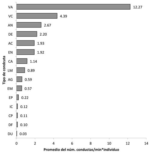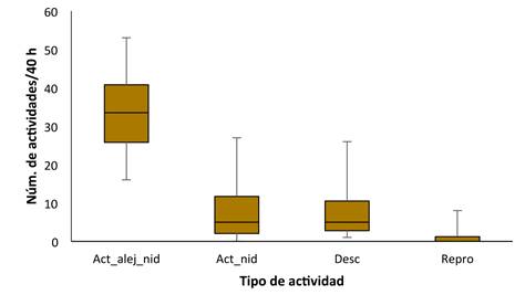 En cuanto a las interacciones, las cotorras exhibieron conductas agonales con mayor frecuencia a las pacíficas (χ² = 8.2, gl = 3, P = 0.01); no obstante, nuestros resultados indican que tales agresiones se presentaron exclusivamente entre individuos de la misma especie, a pesar de la presencia constante (cercana a los nidos) de otras especies de aves como el gorrión casero (Passer domesticus) y T. migratorius. De igual forma, no observamos interacciones con ninguna de las otras 35 especies de aves registradas dentro del Campus.